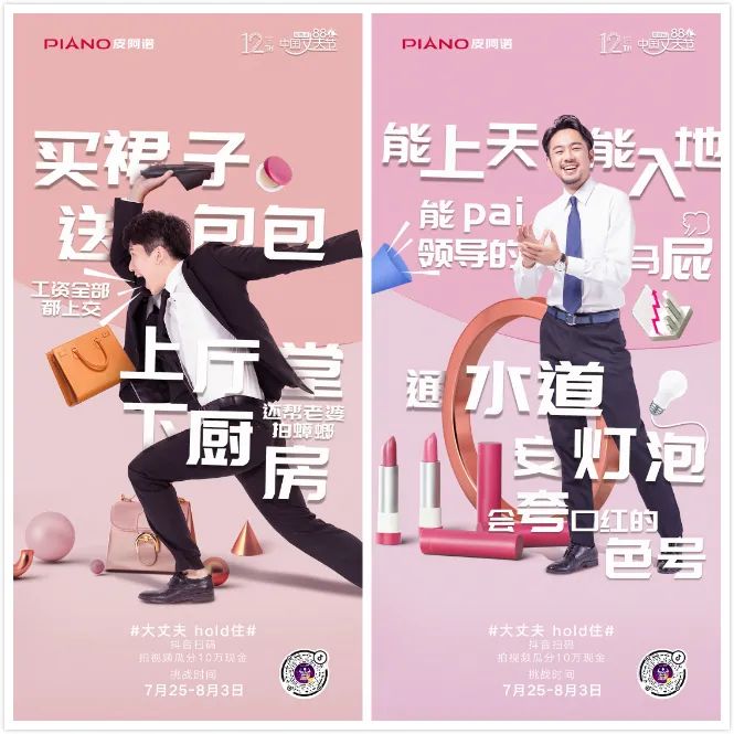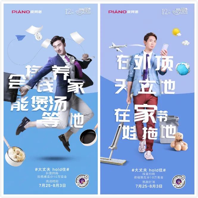 第十二屆88丈夫節,皮阿諾以一部講述大丈夫故事的主題微電影《大丈夫hold住》拉開活動序幕,電影通過尋找丈夫們為何堅持的故事,去發現并贊美屬于平凡丈夫們的偉大,同時在攜手抖音,線上發起“大丈夫hold住”全民抖音任務,拍短視頻瓜分10萬現金活動。上線僅10天時間,話題便獲得超1億的用戶關注與播放。