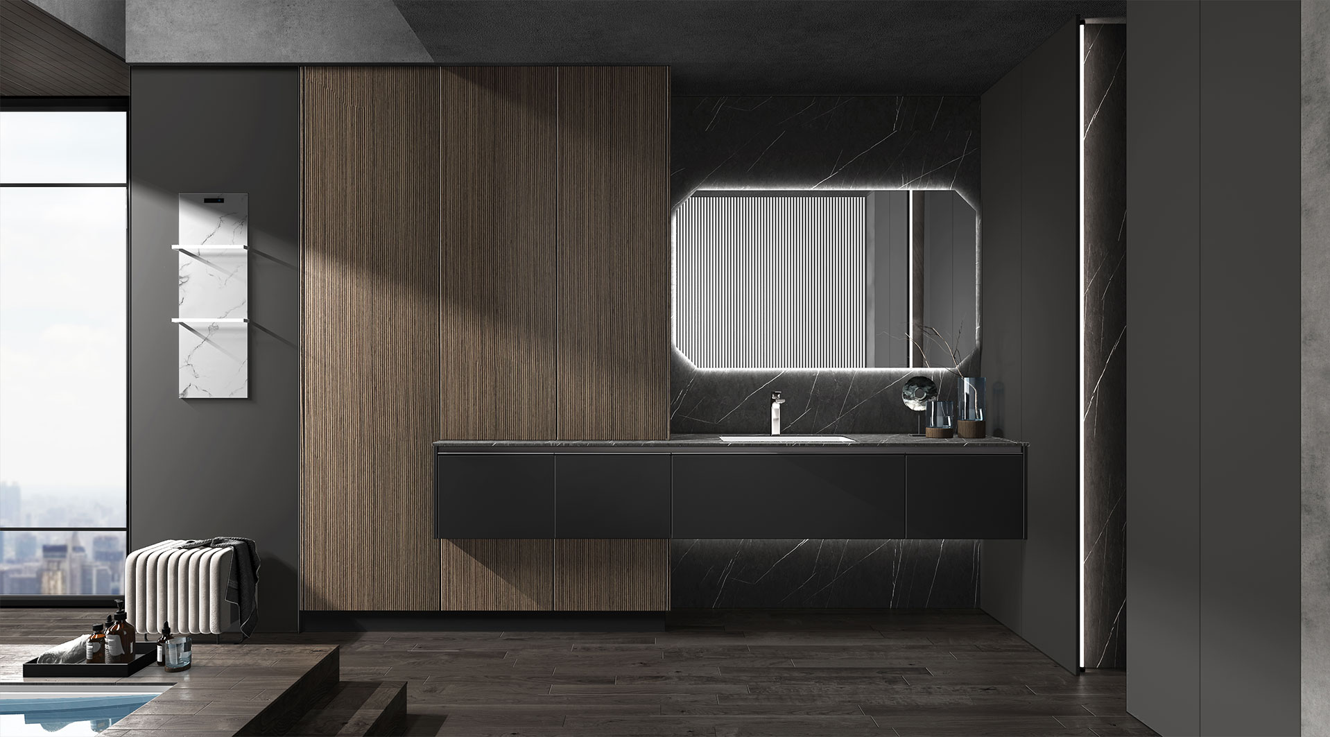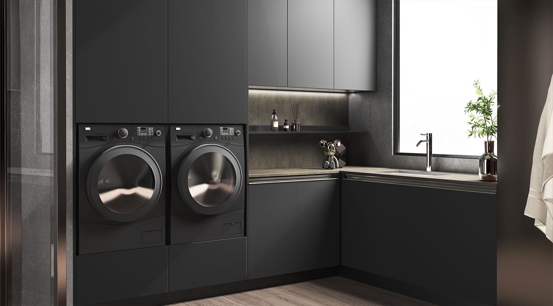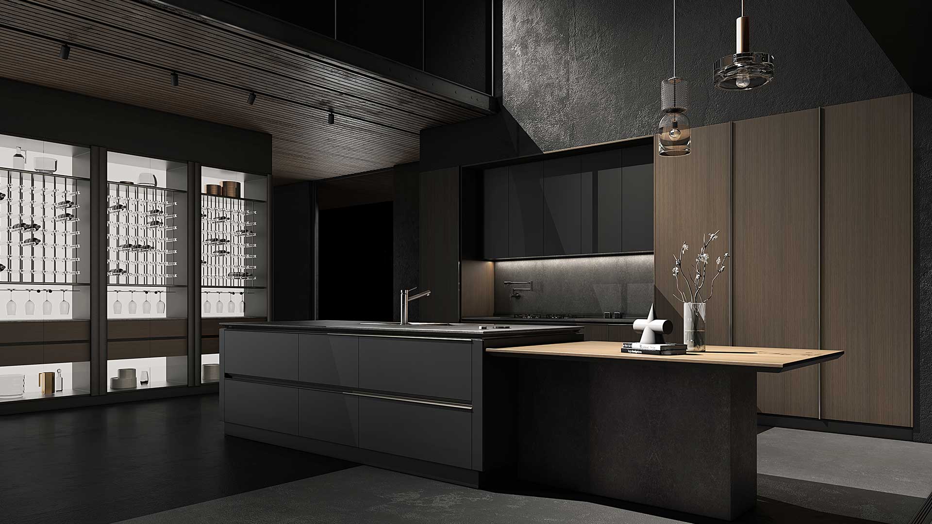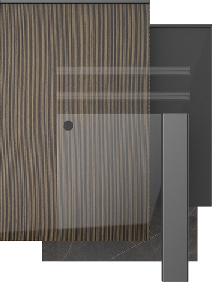 設計師大膽運用碰撞的手法 烏斑木原生肌理,質感自然兼具時尚。啞光金屬烤漆,格調輕奢沉穩(wěn) 兩種不同材質的碰撞,自然感和力量感十足。廚房智慧體驗系統(tǒng)融入整體設計,科技與藝術美學的碰撞融合。