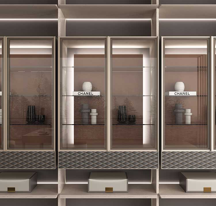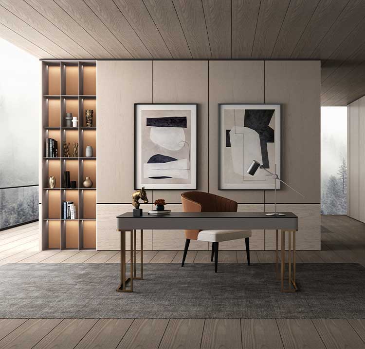 沿襲中庸之道的書房空間設計,以通透的展示柜與掩門柜組合的形式,呈現開放與包容的姿態。在書房空間中,一面向外溝通,一面向內探索。