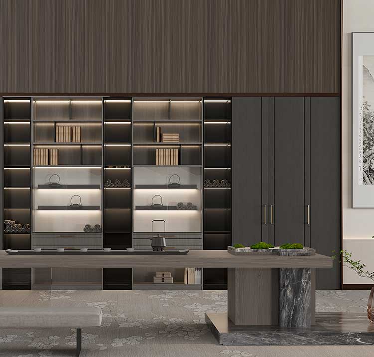 內嵌金屬條設計,輔以富含中式元素的拉手裝飾,