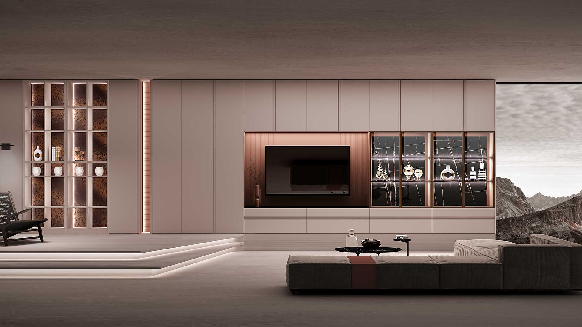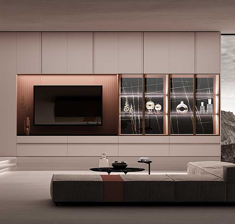 圓弧元素圍繞整體設計,使其更加精致富有設計感,結合鋼化灰玻和烤漆抽面的三明治式分層布局,營造出懸浮感