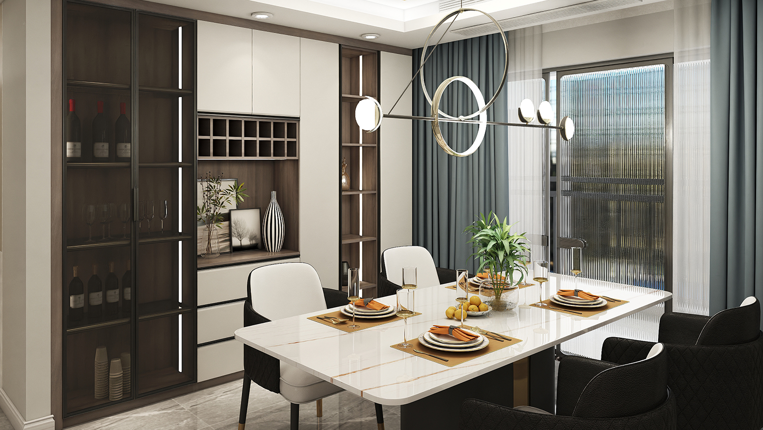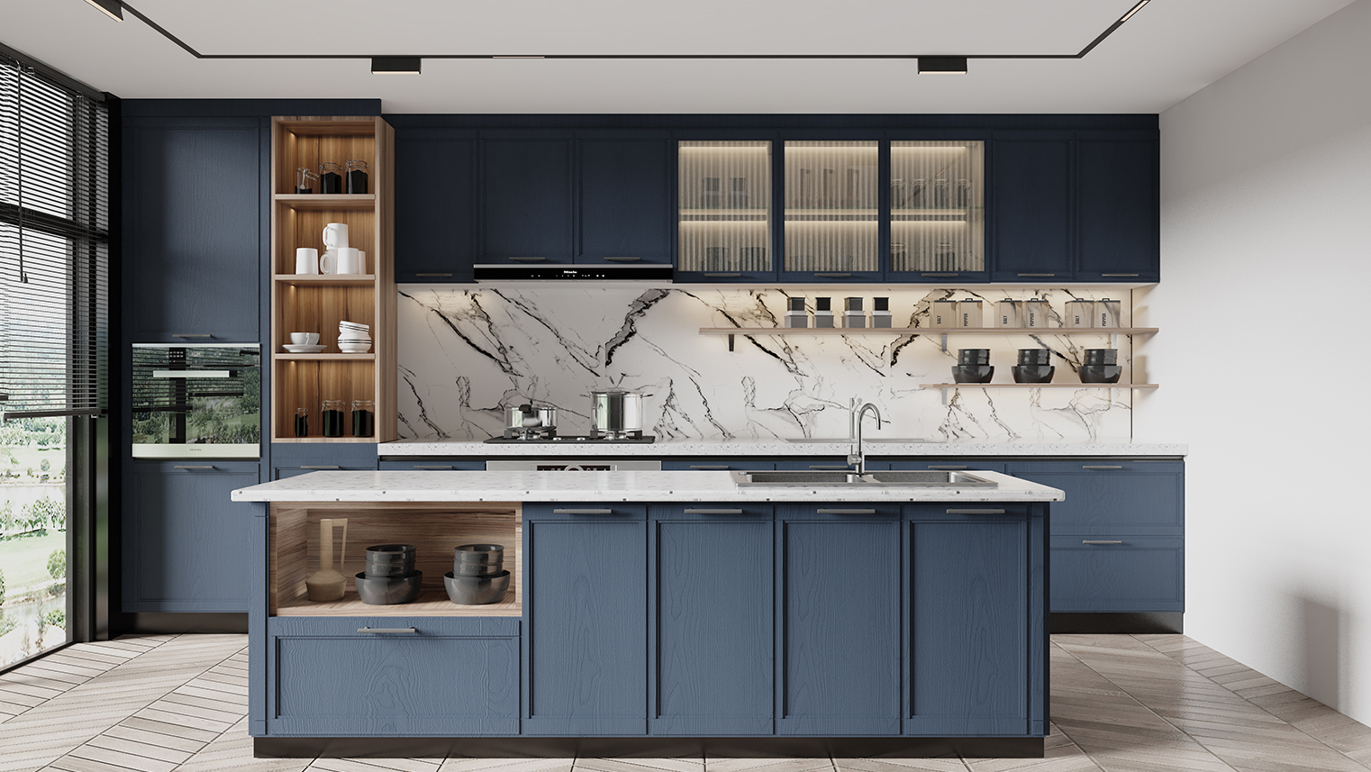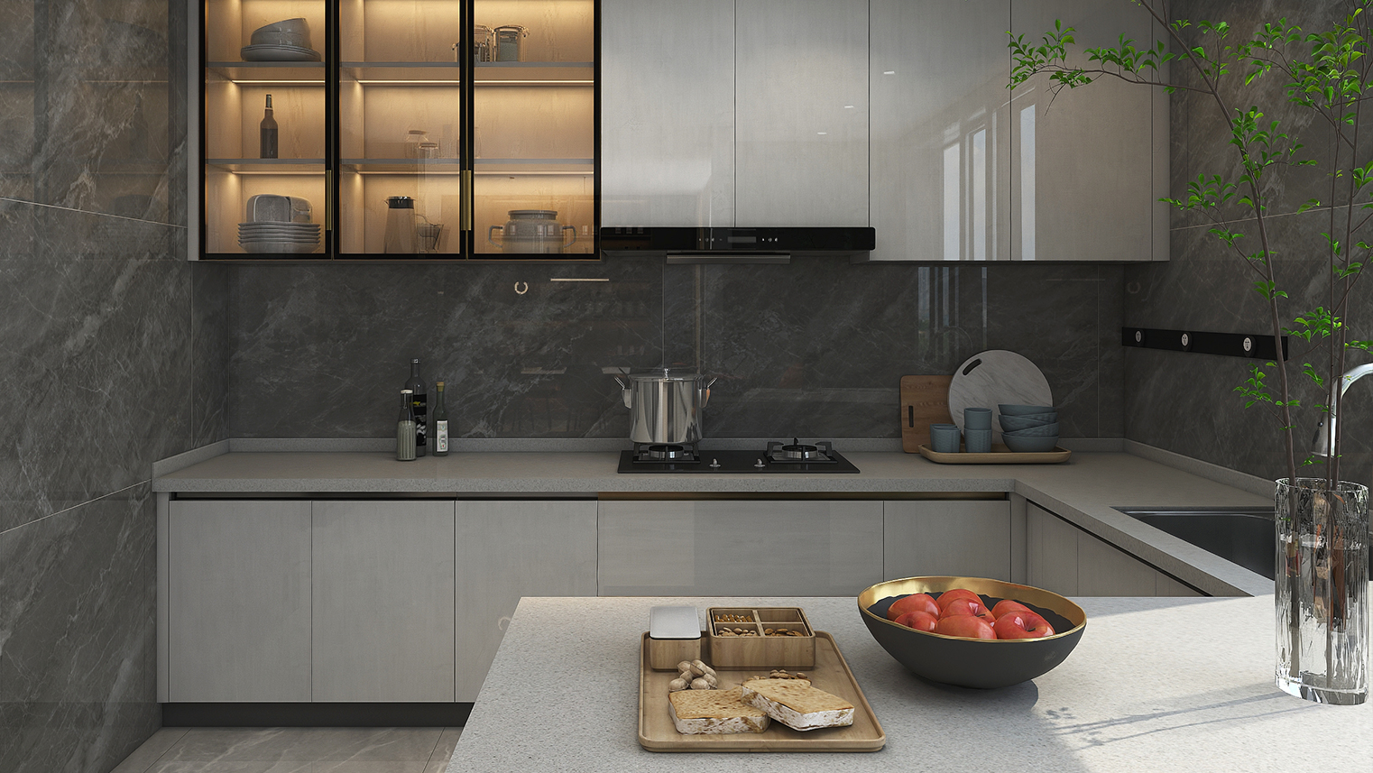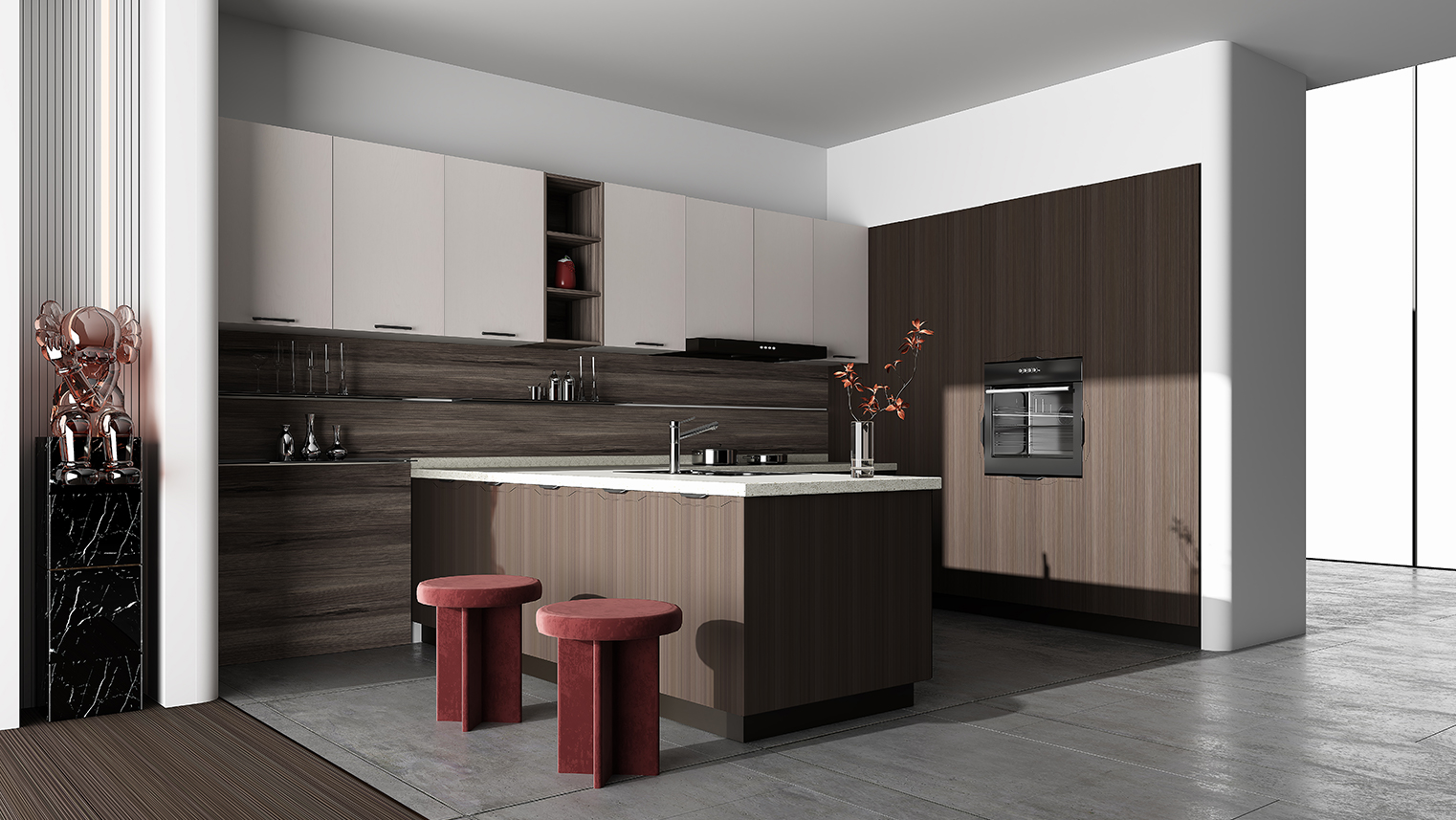 摒棄復(fù)雜的裝飾,著重空前的氛圍,在簡潔大氣的設(shè)計(jì)中增添了一份細(xì)膩與精致。高級(jí)自然的門板肌理搭配玻璃柜、開放柜設(shè)計(jì)?,F(xiàn)代輕奢的視覺美感帶入眼前,使其更富時(shí)代故事感。