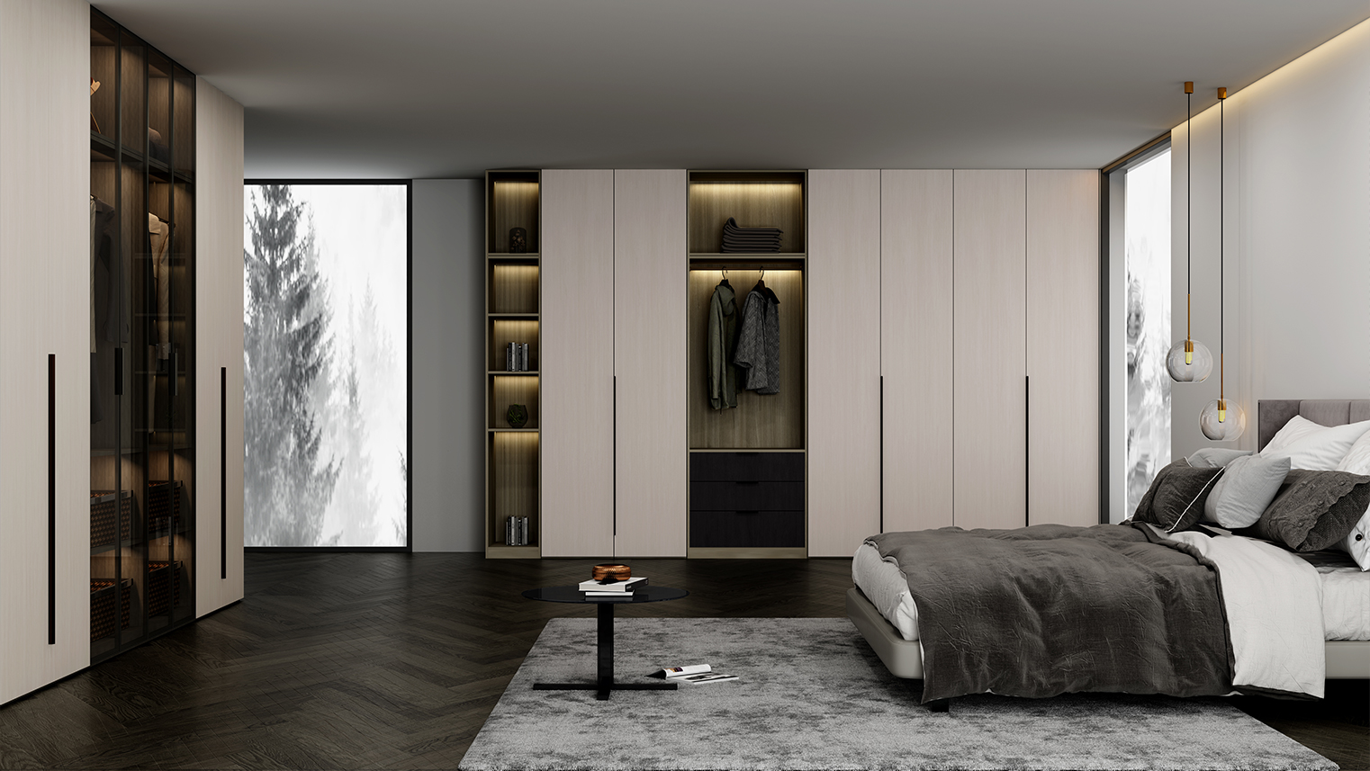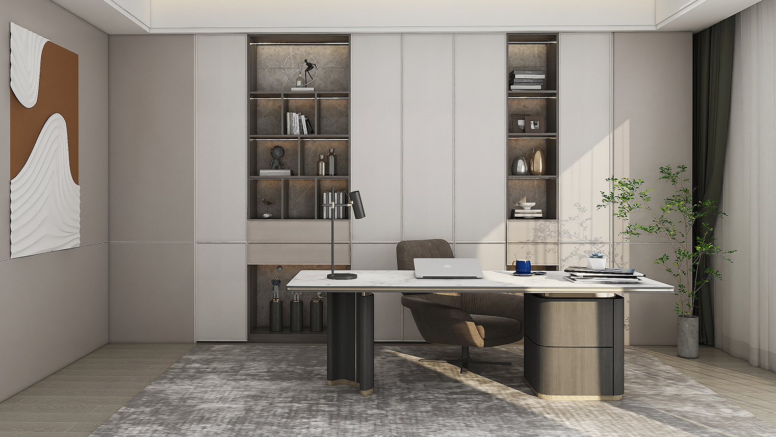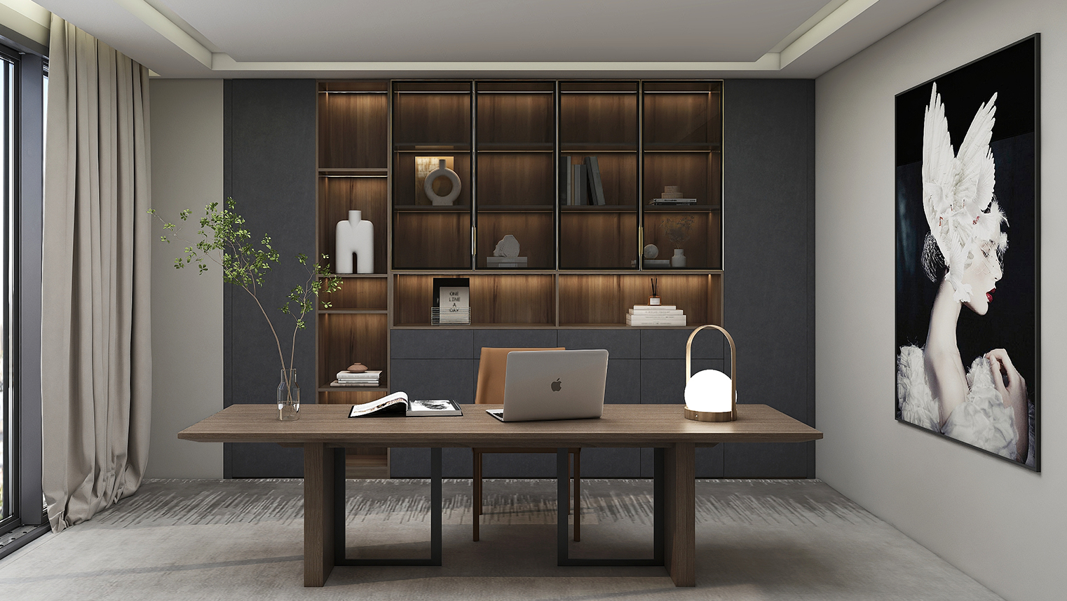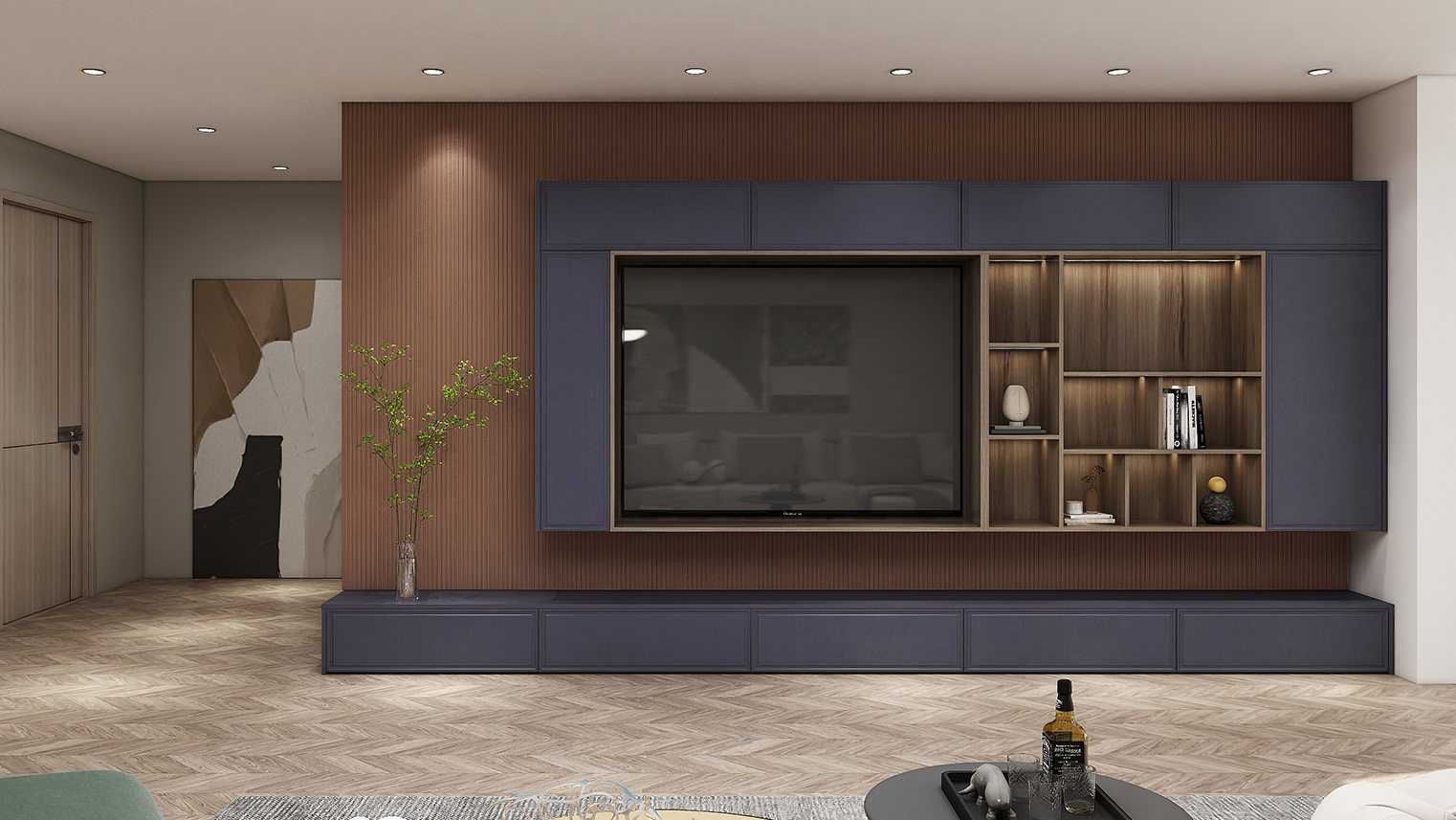 摒棄復(fù)雜的裝飾,著重空前的氛圍,在簡潔大氣的設(shè)計(jì)中增添了一份細(xì)膩與精致。高級(jí)自然的門板肌理搭配玻璃柜、開放柜設(shè)計(jì)?,F(xiàn)代輕奢的視覺美感帶入眼前,使其更富時(shí)代故事感。