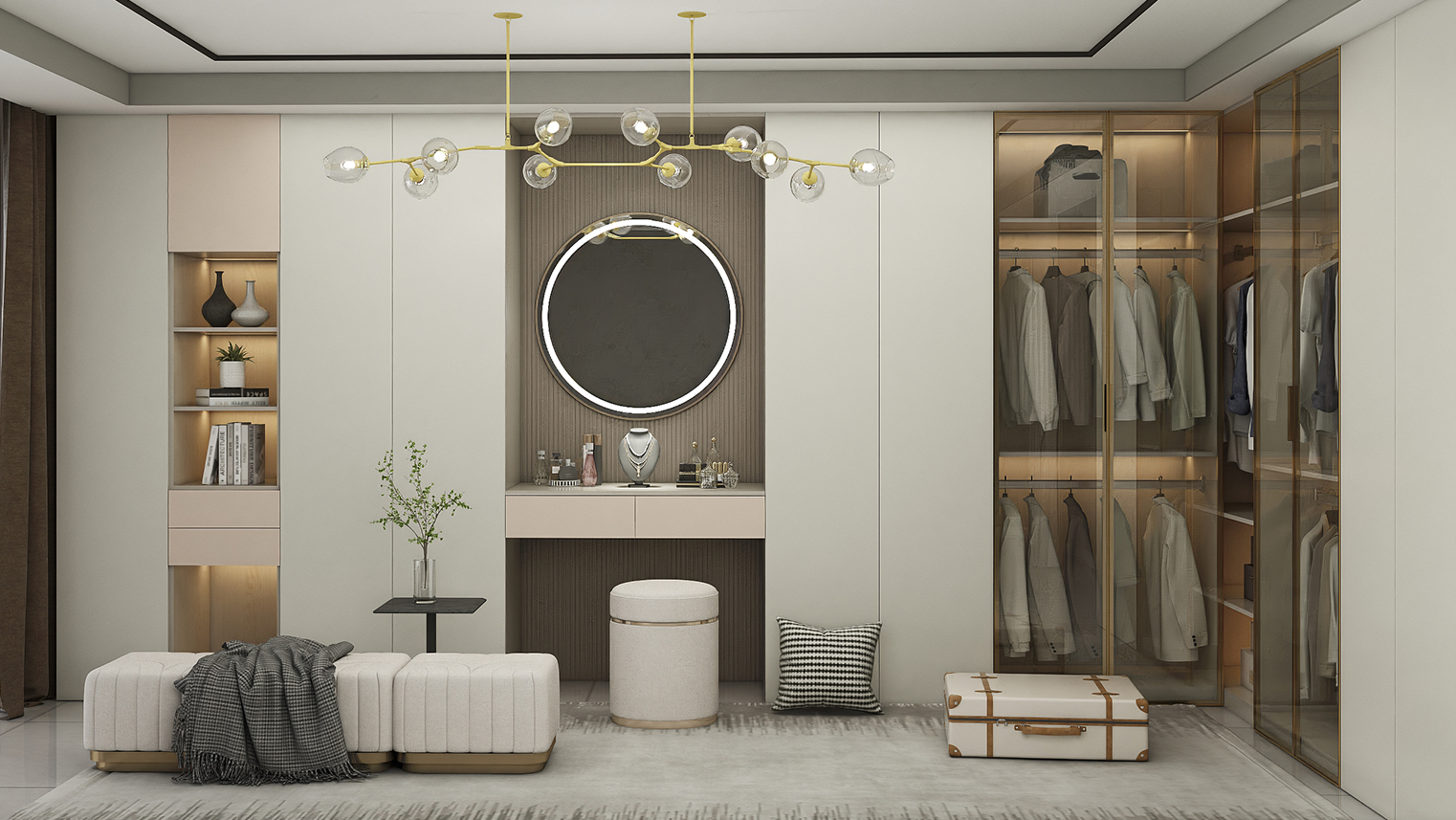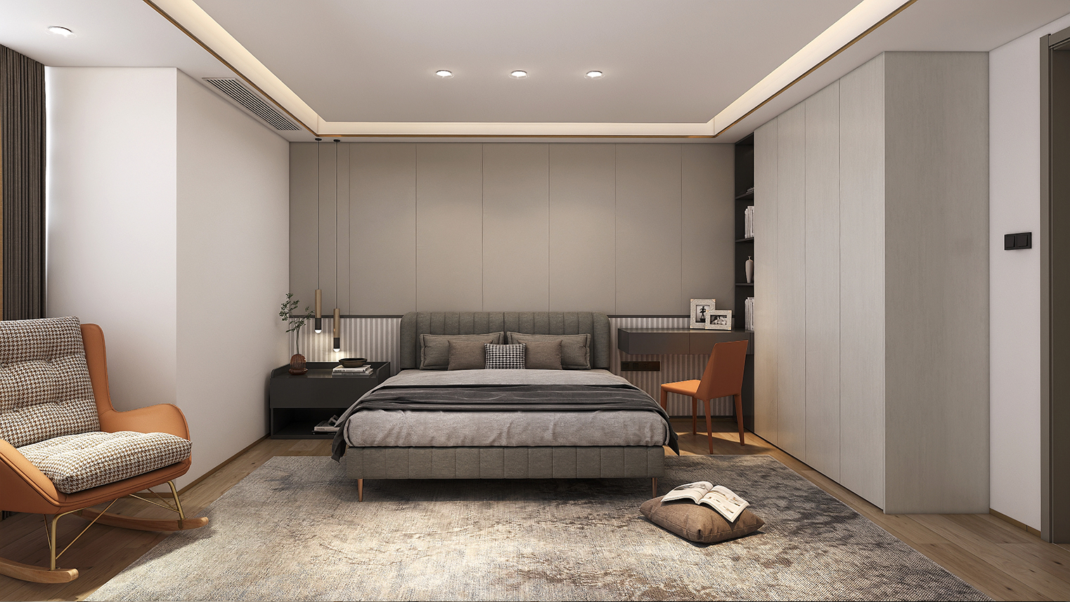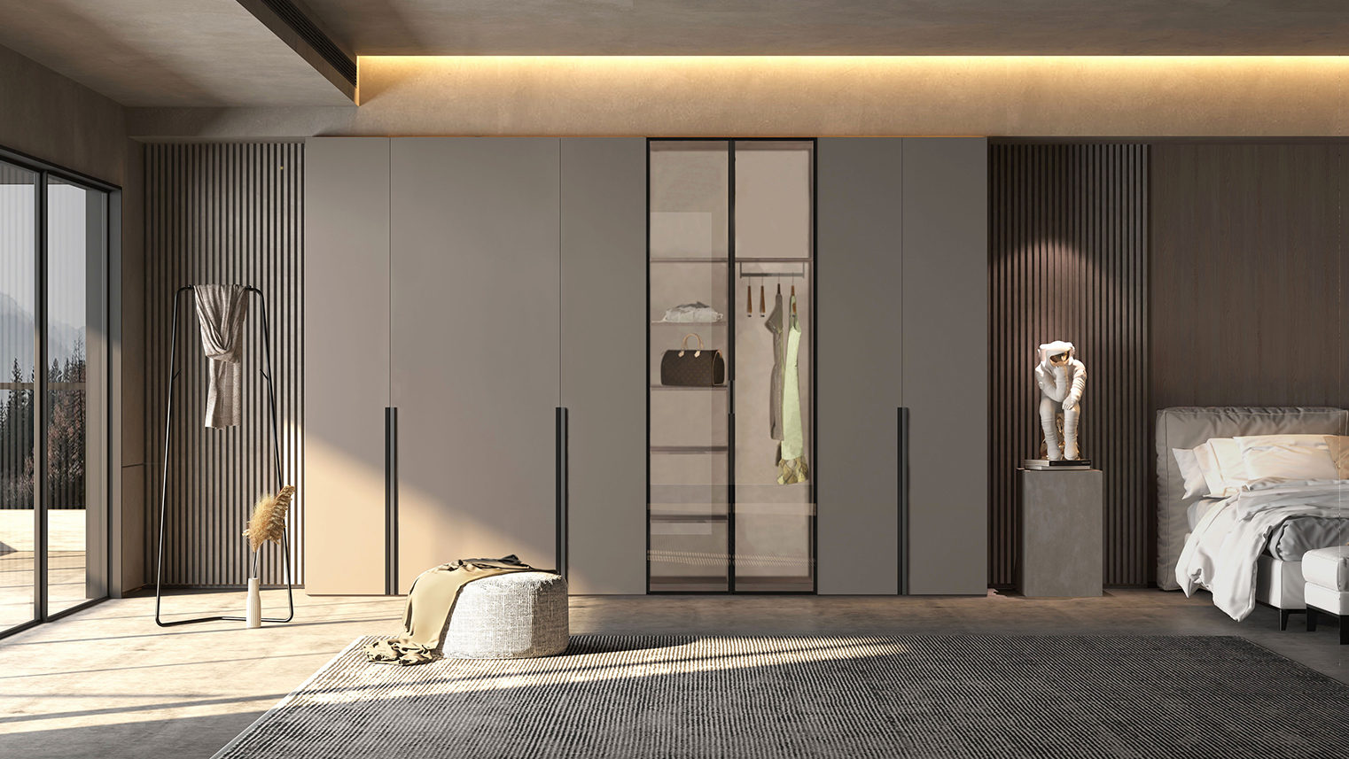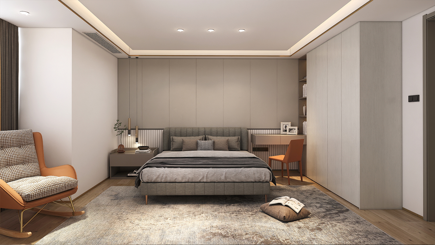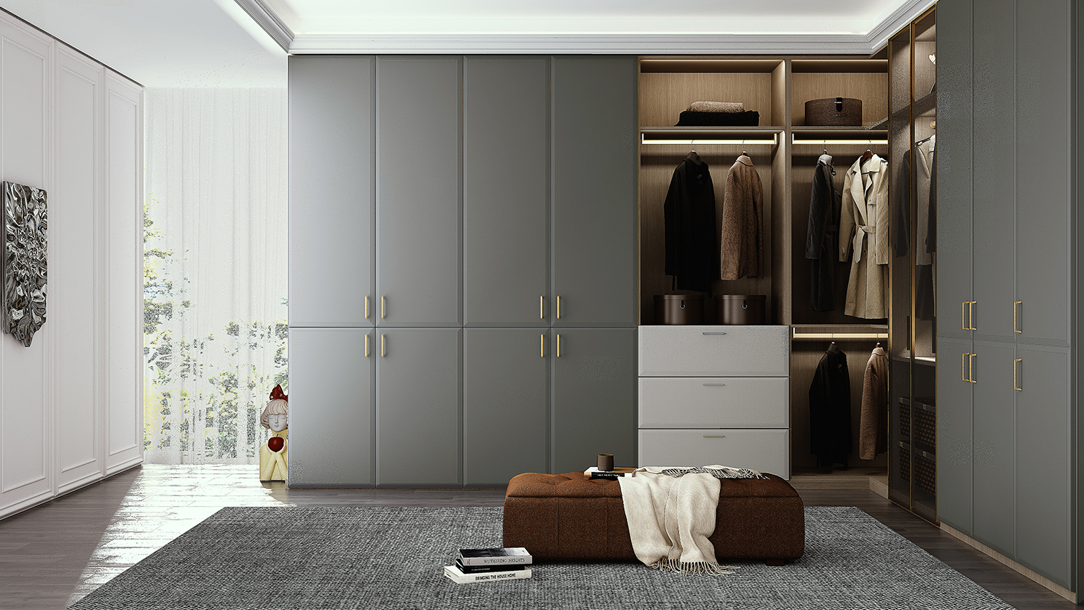 摒棄復(fù)雜的裝飾,著重空前的氛圍,在簡潔大氣的設(shè)計(jì)中增添了一份細(xì)膩與精致。高級(jí)自然的門板肌理搭配玻璃柜、開放柜設(shè)計(jì)?,F(xiàn)代輕奢的視覺美感帶入眼前,使其更富時(shí)代故事感。