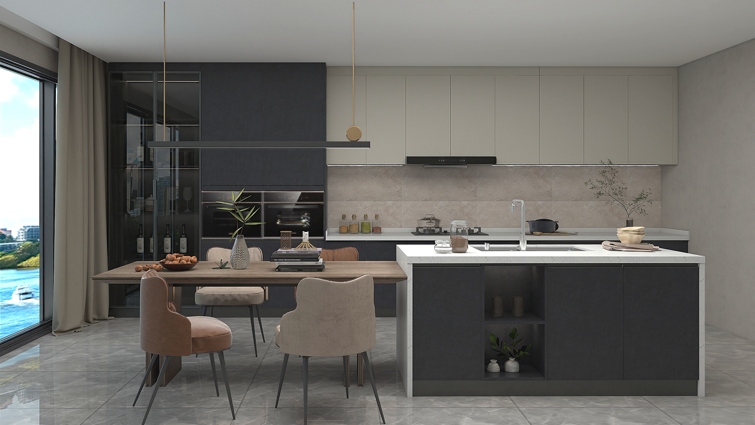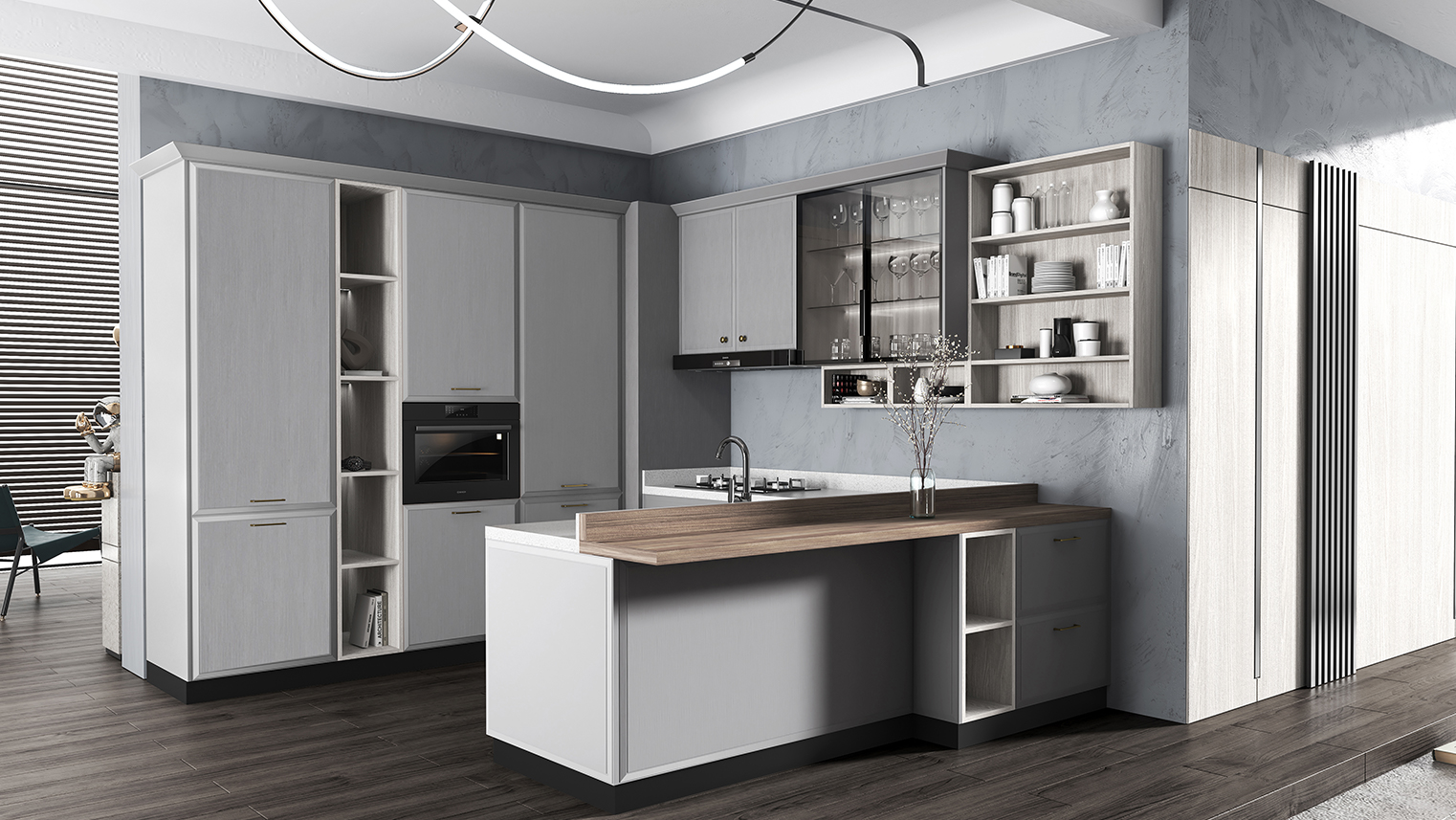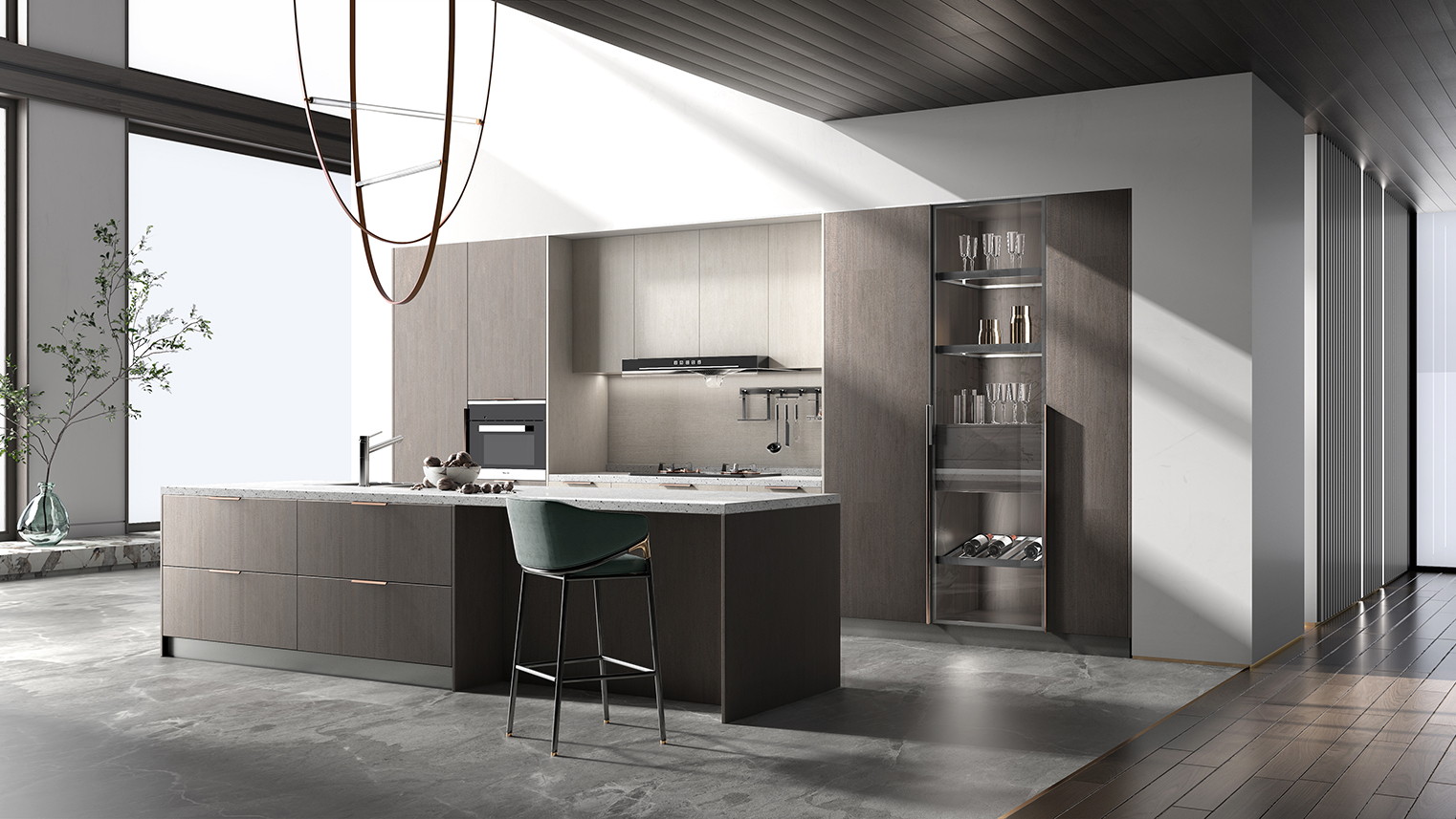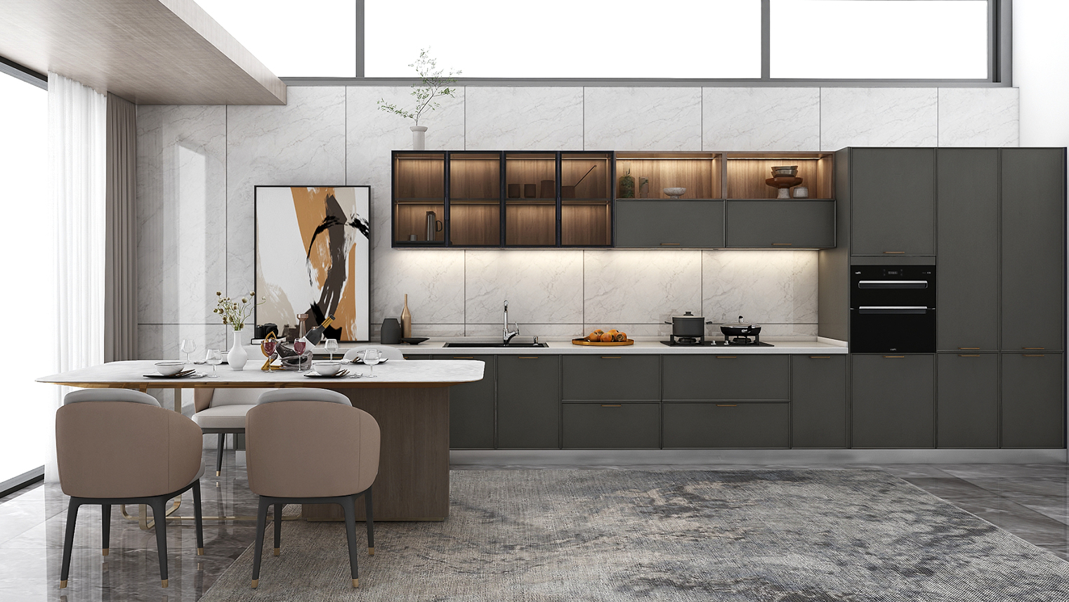 摒棄復(fù)雜的裝飾,著重空前的氛圍,在簡潔大氣的設(shè)計(jì)中增添了一份細(xì)膩與精致。高級(jí)自然的門板肌理搭配玻璃柜、開放柜設(shè)計(jì)。現(xiàn)代輕奢的視覺美感帶入眼前,使其更富時(shí)代故事感。