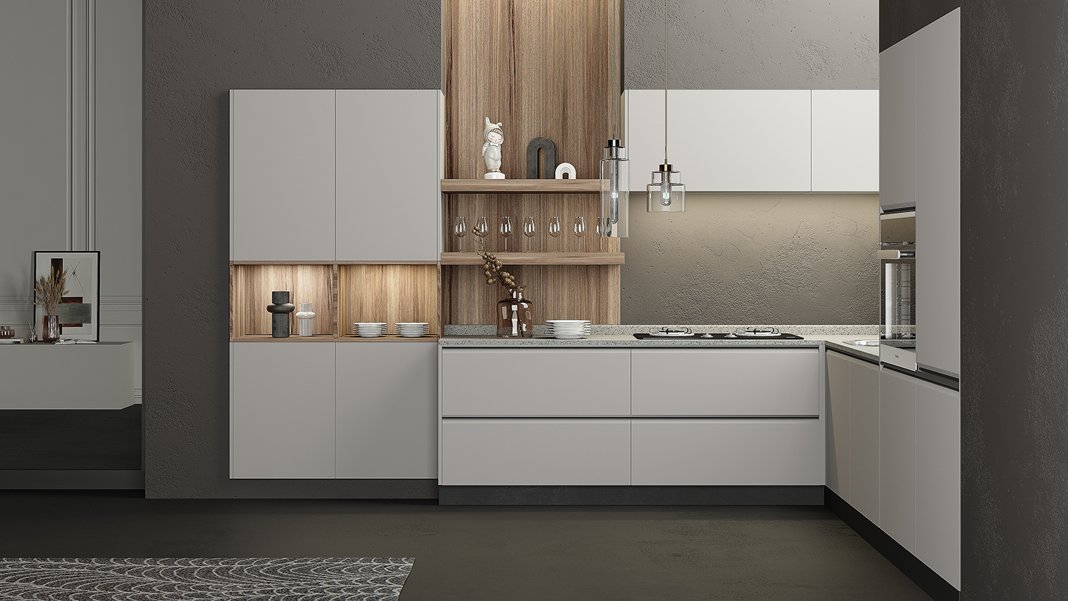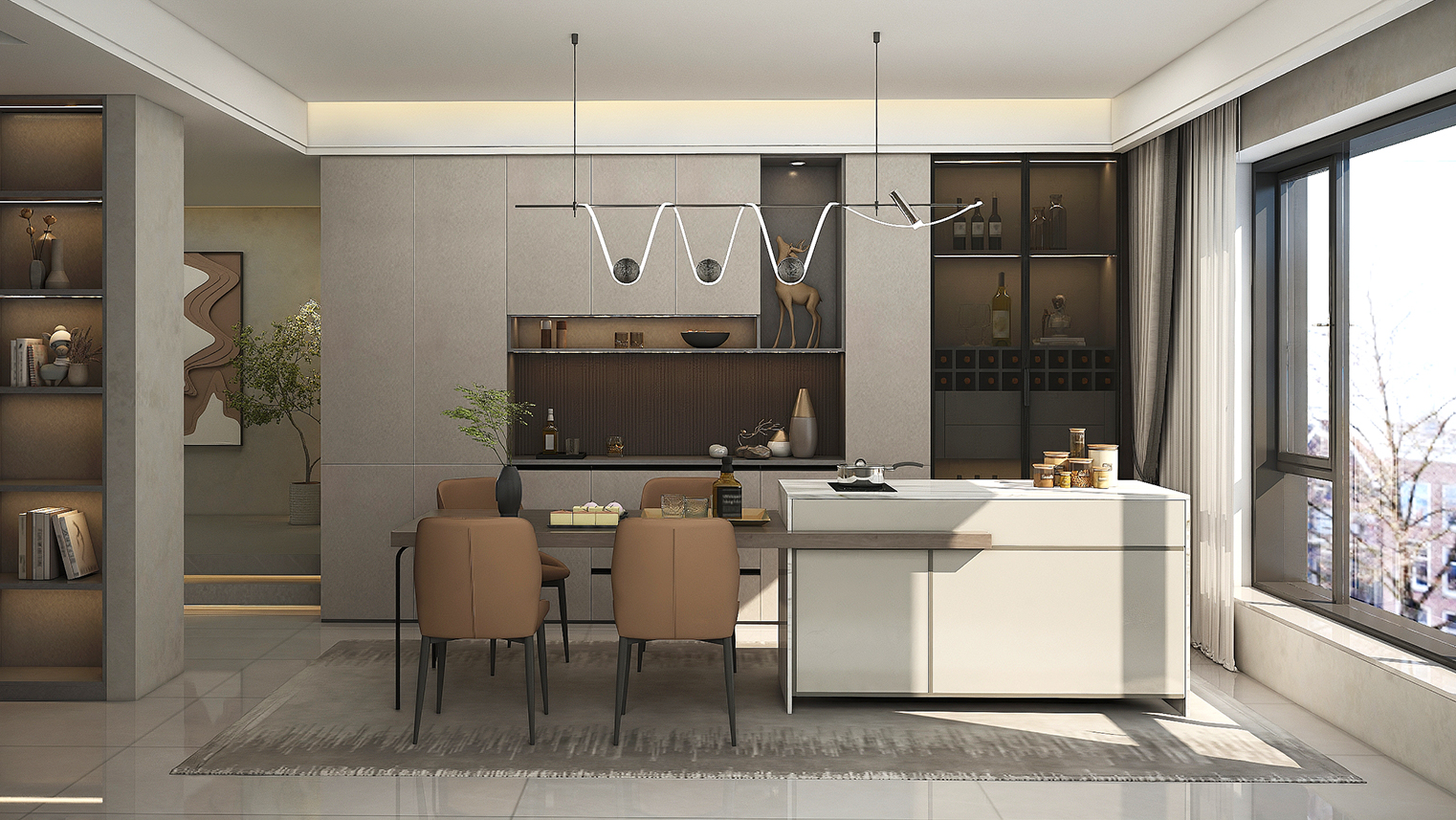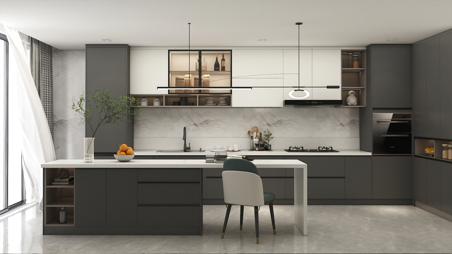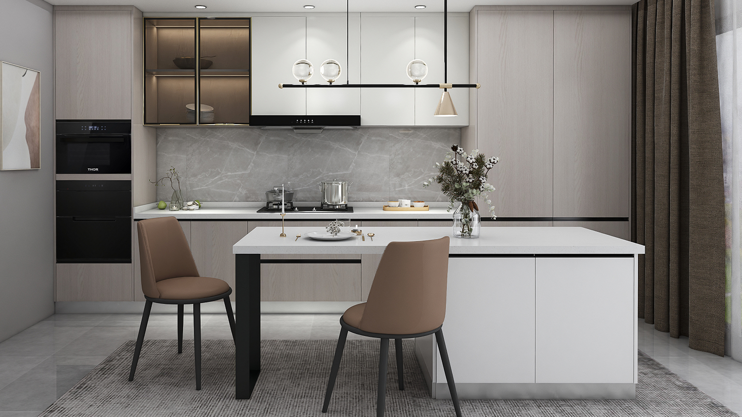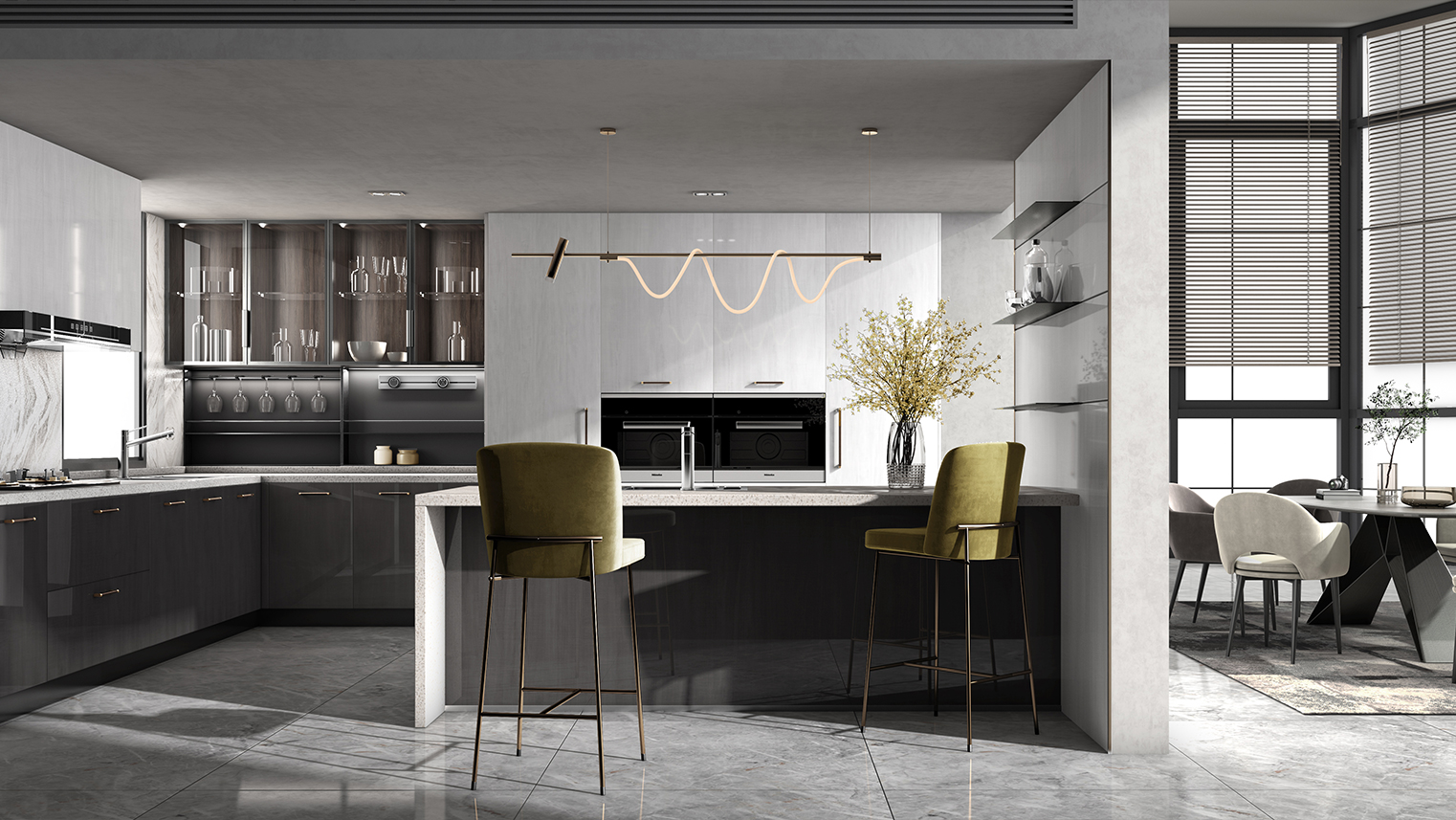 摒棄復(fù)雜的裝飾,著重空前的氛圍,在簡潔大氣的設(shè)計(jì)中增添了一份細(xì)膩與精致。高級(jí)自然的門板肌理搭配玻璃柜、開放柜設(shè)計(jì)。現(xiàn)代輕奢的視覺美感帶入眼前,使其更富時(shí)代故事感。