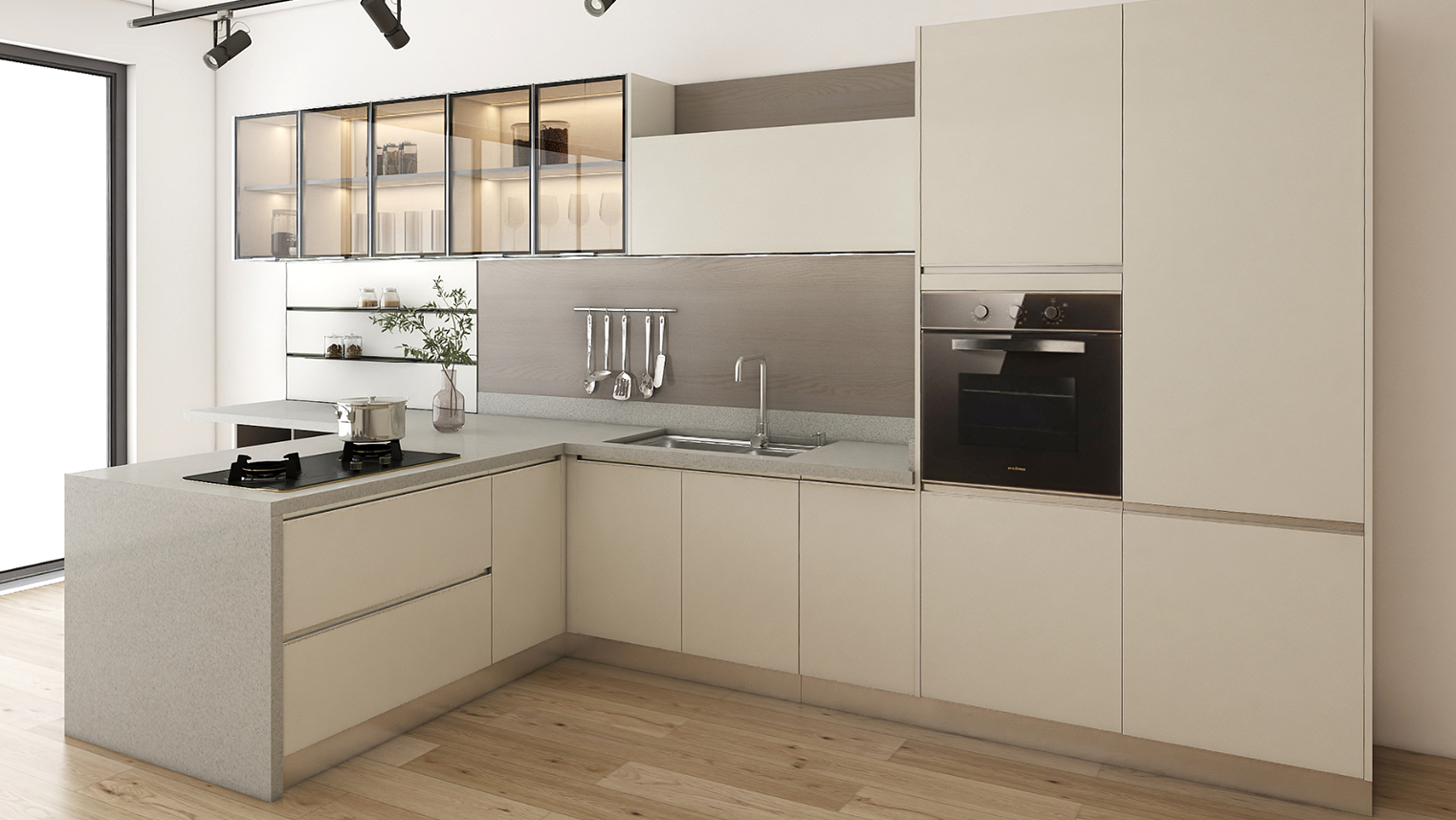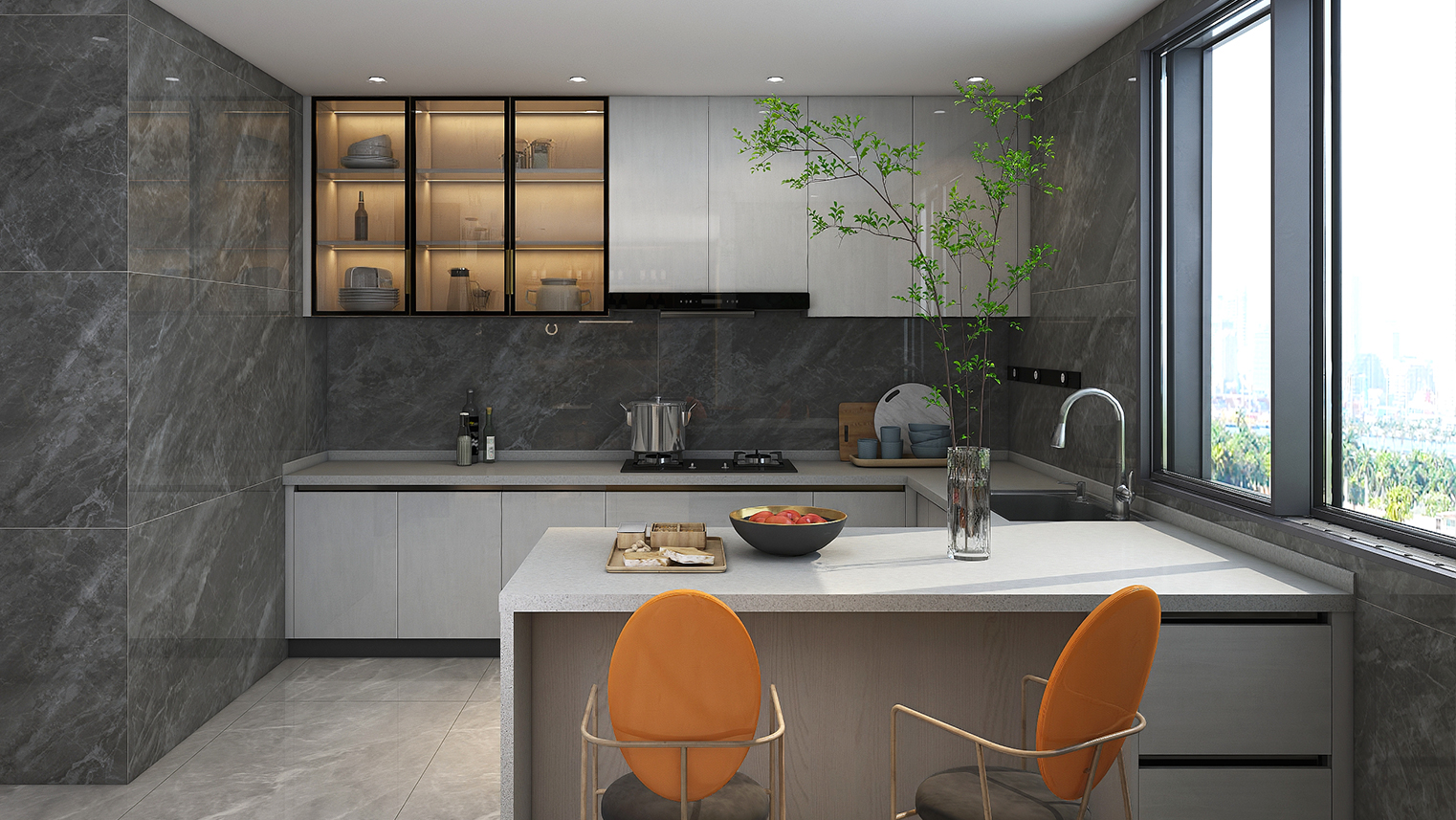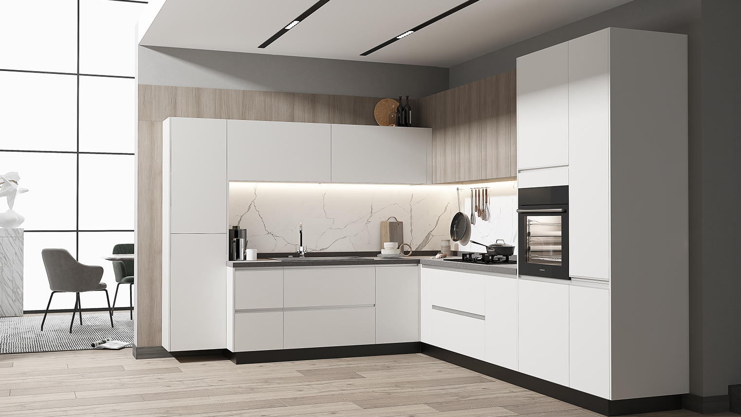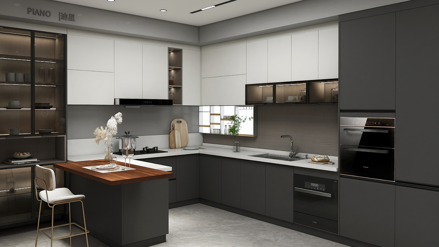 摒棄復(fù)雜的裝飾,著重空前的氛圍,在簡潔大氣的設(shè)計(jì)中增添了一份細(xì)膩與精致。高級(jí)自然的門板肌理搭配玻璃柜、開放柜設(shè)計(jì)。現(xiàn)代輕奢的視覺美感帶入眼前,使其更富時(shí)代故事感。