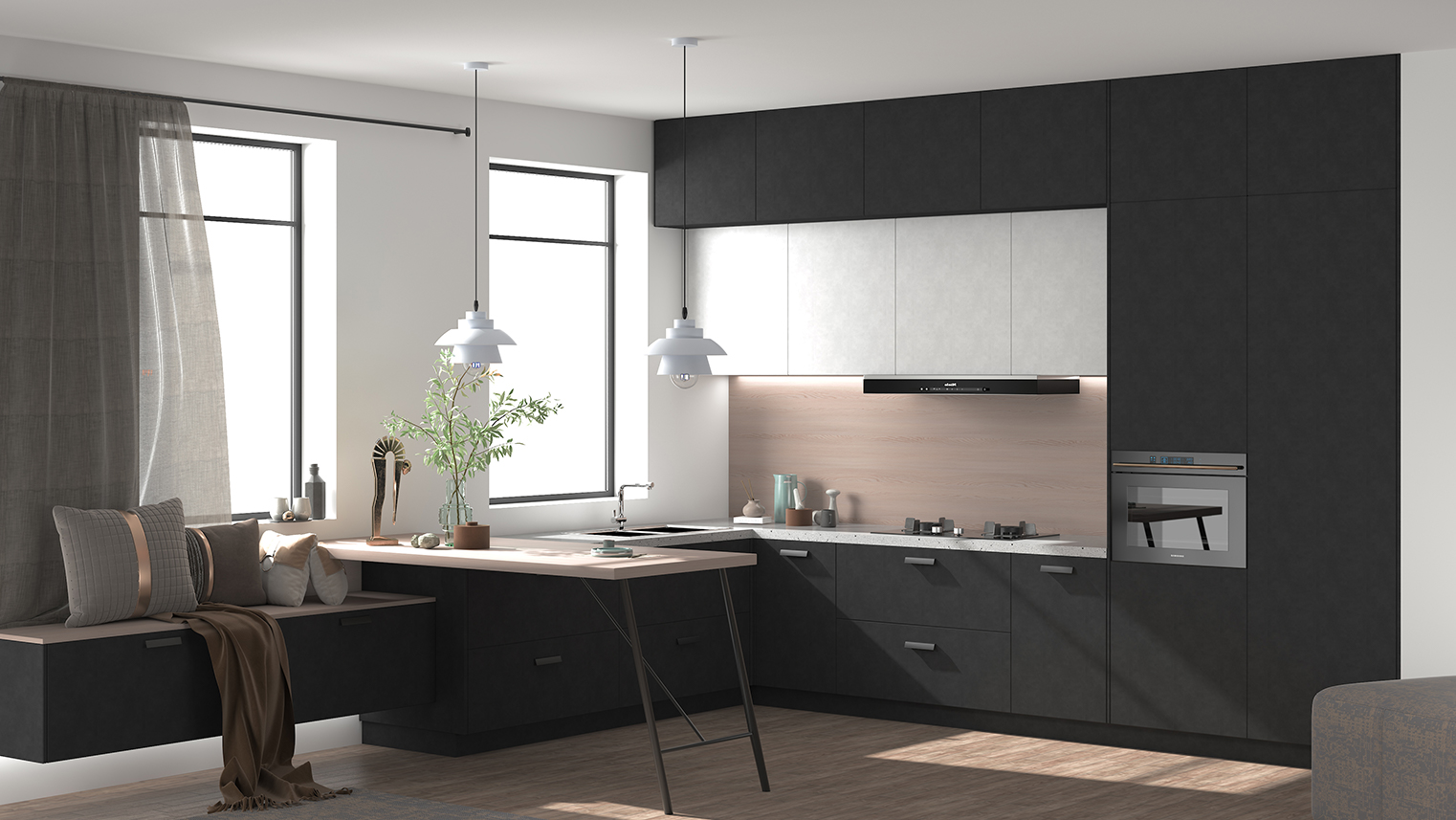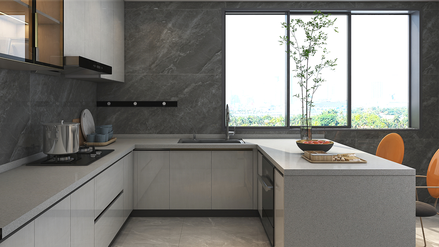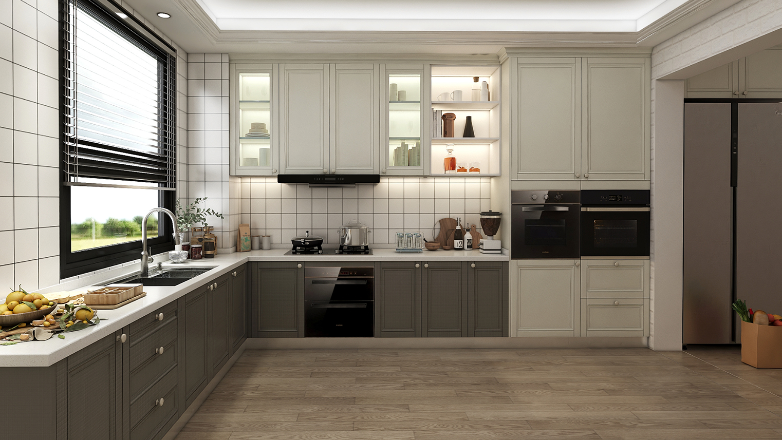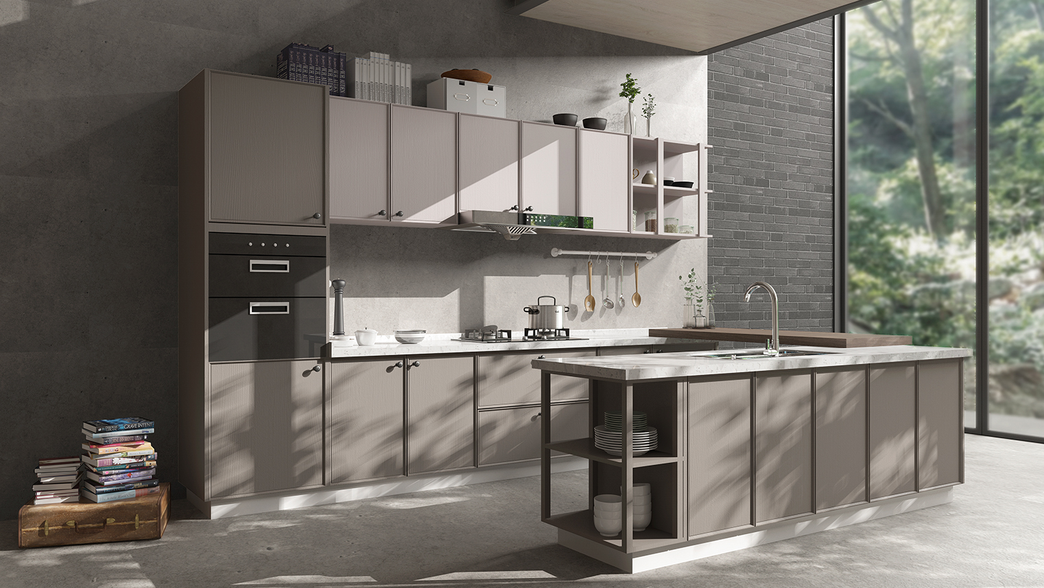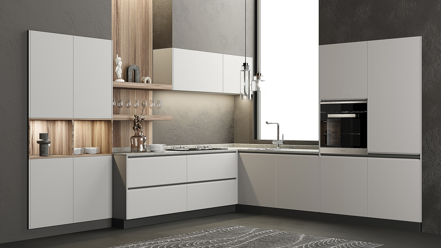 摒棄復(fù)雜的裝飾,著重空前的氛圍,在簡潔大氣的設(shè)計(jì)中增添了一份細(xì)膩與精致。高級(jí)自然的門板肌理搭配玻璃柜、開放柜設(shè)計(jì)。現(xiàn)代輕奢的視覺美感帶入眼前,使其更富時(shí)代故事感。